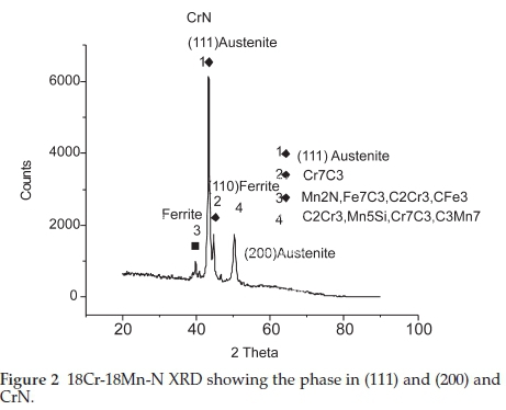 Nitrogen increments the austenite phase in the steel. Hartline found than austenitic steels are more resistant to pitting corrosion than duplex steels, and more resistant than ferritic steels, which is an additional factor in the properties of austenitic steels.12 Zhang et al. found cell Cr2N and Chi phase, in which they attributed the increase in resistance to the bite of austenitic nitrided steel.13
