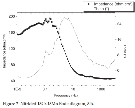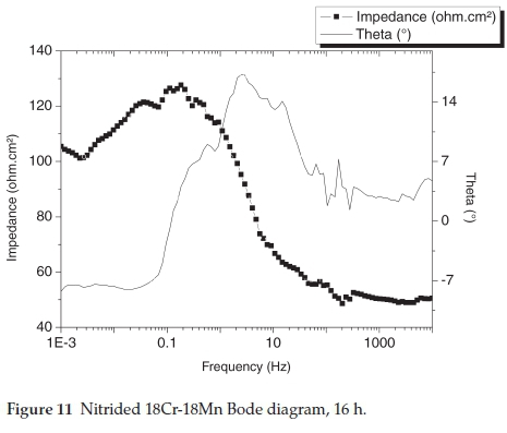 Figures 5, 6, 7 and 8 show the impedance values our steels, which is related to corrosion resistance, at 8 h. The value for forged-nitrided 18Cr-18mn is the largest; this steel has an extremely high corrosion resistance value compared to the other three steels. Mandi found expanded austenite (protective white layer) and to this he attributed the high corrosion resistance of nitrided steel.14 Toshkov et al. also mentioned corrosion resistance properties because expanded austenite formed due to nitrides.15 This agrees with our corrosion rate as the rate of corrosion of this steel was the one with the lowest value. Their steel that had the lowest impedance value is the 18Cr-18Mn steel, close to 90 ohms cm-2. This is consistent with our results on corrosion rate; besides, we found that this steel has a higher rate of corrosion. We repeated the experiment six times.