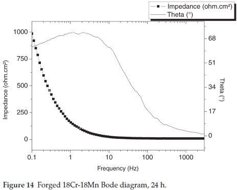 In our electrochemical corrosion test, Bode diagrams were obtained at 8,16 and 24 h with the steel in saline solution (3.5 % NaCl in distilled water). We used an amplitude of 10 mV with a frequency range of 1 mHz to 10 KHz. We repeated the experiment six times.