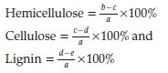 The calculations for the respective percentage compositions of lignin, cellulose and hemicellulose were carried out using the following equations: