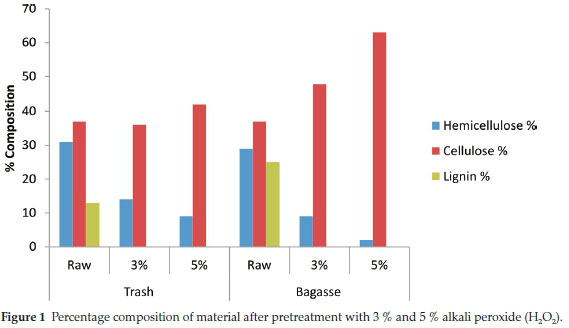 Results for raw untreated bagasse indicate that there were almost similar fractions of hemicellulose and cellulose in bagasse as in the trash of 29 %, 37 % but with a higher fraction of lignin of 25 %, respectively. The pretreated bagasse contained significantly higher levels cellulose of 48 % and 63 % after pretreatment with 3 % and 5 % alkali peroxide, respectively. This represents a 28 % increase and a 70 % increase, respectively, in available exposed cellulose for use in further processes. As the amount of lignin decreased, this resulted in higher percentages of cellulose available therefore indicating the more effective the pretreat-ment method. The same results of biomass composition are indicated in the form a bar graph in Fig. 1.