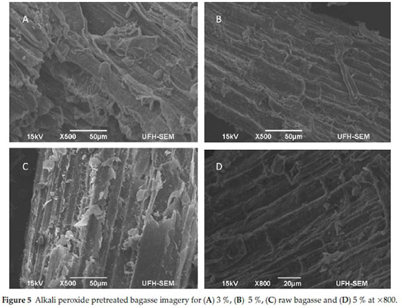 Scanning electron microscopy images for bagasse which was pretreated with alkali peroxide indicate there was an increase in visibility of individual cells with an increase in percentage concentration as shown in Fig. 5. The raw untreated bagasse (C) did not have clearly visible cellular division as compared to 3 % and 5 % alkali peroxide pretreated bagasse (A) and (B), respectively. This increase in cellular outline visibility can be attributed to the swelling of the material upon pretreat-ment.