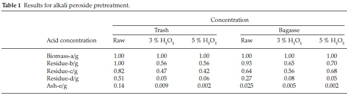 Lignocellulosic bagasse and trash were pretreated with alkali peroxide. The raw untreated material as well as the pretreated material's compositions were characterized for percentage composition by using Chesson method.1 Results of the experimental procedures undertaken to quantify the percentage compositions of the raw trash and pretreated trash as well as the raw bagasse and pretreated bagasse are indicated in Table 1. Each experiment was done in a minimum of duplicates and the results averaged and recorded.