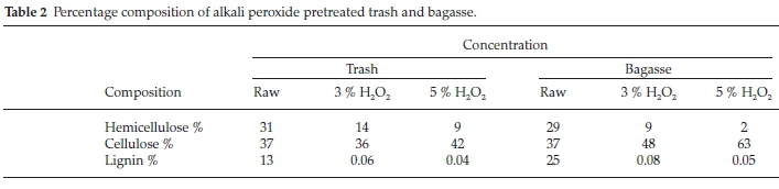 Results in Table 2 indicate the raw trash before pretreatment had been effected consisted of 31 % of hemicellulose, 37 % of cellulose and 13 % of lignin content. These percentages changed considerably after pretreatment with 3 % and 5 % alkali peroxide concentrations. Pretreatment with 3 % and 5 % alkali peroxide resulted in the hemicellulose content being reduced to 14 % and9%ofthepretreatment residue, with hemicellulose being also reduced to 0.06 % and 0.04 % of the pretreatment residue, respectively. Cellulose content on the other hand increased slightly after 5 % alkali peroxide pretreatment to 42 % of the pretreatment residue indicating a 13.5 % increase. However there wasa1%decrease in cellulose fraction after pretreatment with 3 % alkali peroxide. Pretreatment of trash with 3 % alkali peroxide resulted in lower changes than when compared to pretreatment with 5 % alkali peroxide. Delignification of sugarcane bagasse was also higher for pretreatment with 5 % hydrogen peroxide than pretreatment with 3 % hydrogen peroxide.