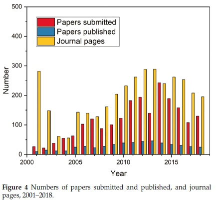 The numbers of papers published, year by year, have shown some fluctuations. The early 1990s, in particular, were subject to some noticeable variations in numbers of papers processed. As a result of problems at the Bureau, the publication schedules were severely disrupted, such that several times issues had to be combined; for seven years between 1990 and 1999 only two or three issues appeared per year, with fewer than 100 journal pages being produced in 1993 and 1996. This was a matter of great concern to the publications officer, Mr Percy Bloom, who expressed extreme dissatisfaction with the performance of the publishing house. A lack of confidence on the part of authors became apparent, mainly due to uncertainties as a result of the erratic appearance of the issues of the Journal, leading to a consequent decline in submissions. The numbers of papers published by year, from 1977 to 2000, and the number of journal pages, are illustrated graphically in Fig. 3, and are listed in detail in Table S7. Another significant slump occurred between 2001 and 2004. Once authors had become familiar with the use of the electronic publication system, however, numbers of submissions recovered again, and from 2006 the editor-in-chief was regularly receiving over 100 manuscripts per year, with a record 243 papers being submitted in 2014. From 2001, when the editors-in-chief started recording the numbers of submissions received per year in their annual reports, it was possible accurately to monitor the throughput of manuscripts. The numbers of manuscripts received and papers published, and numbers of journal pages per year from 2001 to 2018 are presented in graphical form in Fig. 4 and are shown in Table S8.