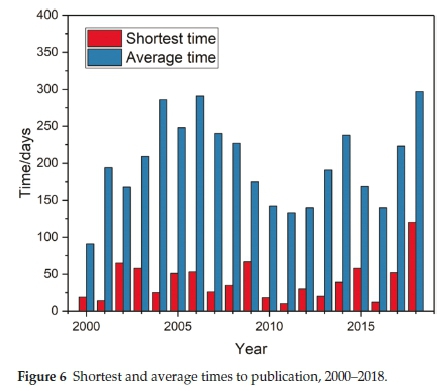 From 2000, when the Journal started routinely including the dates of submission, revision and acceptance for each paper published, it became easy to record the rates of progress of manuscripts through the publication system. Associated with the streamlining of the publication process, the average times from submission to publication saw a steady reduction and the fastest times to publication indicated some fairly rapid turnovers from 2010 to 2016. These times to publication are reported in Fig. 6 and Table S10. The record for the shortest delay from submission to appearance online, one which may never be broken, was achieved in 2011. This record was enjoyed by a paper reviewing 20 years of research and development of battery technology at the CSIR from 1974 to 1994. It was submitted in response to an invitation by the editor-in-chief to Institute members to celebrate the International Year of Chemistry in 2011. It was accepted 10 days after it was received. At the other end of the scale no fewer than 48 publications have had gestation periods in excess of one year. Most of these submissions were from foreign authors, and the long delays can be largely attributed to the need for successive revisions to be carried out in order to improve the quality of the English. The longest period between submission and publication, 1086 days, was experienced by a paper on chemistry education, the revision of which took over two years before the manuscript was resubmitted. The editors are well aware of the need to put pressure on their more tardy reviewers, and to encourage authors to complete the required revisions with the minimum of delay, the alternative being for the editors summarily to withdraw the manuscripts from the publication stream.