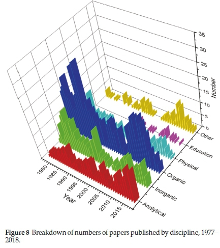 As a non-specialist periodical, the Journal has always accepted papers from all branches of chemistry. While the popularity of the four traditional disciplines has been subject to unpredictable fluctuations, over the period from 1977 to 2018 analytical, inorganic and particularly organic chemistry have been consistently the most strongly represented areas. In the case of organic chemistry, the popularity of this field among local authors can be attributed chiefly to the long-standing tradition of research in natural product chemistry in South Africa. In recent years, however, papers in catalysis, computational chemistry, green chemistry, materials science and nanochemistry, for example, have reflected international trends in the upsurge of interest in those newer branches of chemistry. These branches are grouped together as 'other' in Fig. 8 and Table S12. Chemistry education has been consistently under-represented over many years.