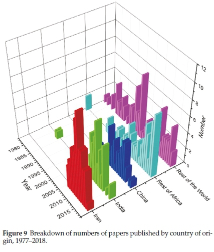 In its early years, apart from the odd submission mainly from the UK, USA, Germany and India, the Journal published papers exclusively from South African authors. Due mainly to the new political dispensation, the position changed in 1994, with the start of an influx of papers from other countries, notably from elsewhere in Africa. In that year for the first time the percentage of South African manuscripts fell below 80 % of the total and in 2007 the percentage reached its lowest level of 30 %. Since then, the percentage of South African papers published has exceeded 50 % only in 2009, 2011 and 2016. A breakdown of published papers according to countries of origin is given in Fig. 9 and Table S13. These data show the spread of regions of the world from which potential authors have found the Journal to be an agreeable vehicle in which to showcase their work. In the period from 2000 to 2018 the leading countries from which foreign manuscripts originated have been Iran, India and China, while a small number have been received from such exotic locations as Oman, Guyana, Yemen and Macedonia.