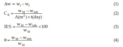 where ∆w represents the weight-loss, with wi and wf the initial and final weights of the coupons, respectively, and wbl and winh the weigth-loss values obtained in the unprotected and protected environments. A is denoted as the entire area of the steel and t represents the time duration of the study.