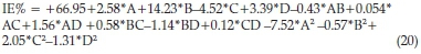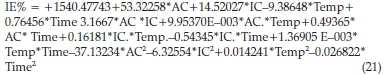 The mathematical model of the efficiency of the BKL extract as a function of the considered factors is expressed in terms of coded and actual factors. A quadratic model described the systematic connections between the inhibition efficiency and the factors of acid concentration (AC), inhibitor concentration (IC), temperature (T) and time (t). The coded factors were used to evaluate the response for given levels of each factor. By default, the maximum levels are fitted as +1, and the minimum levels are fitted as -1. The coded equation is useful in determining the impact of the factors. The analysis of variance (ANOVA) is presented in Table 10.