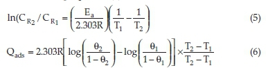 where Ea is the activation energy, R denotes the gas constant and, θ1 and θ2 represent the degree of surface coverage at temperature T1 and T2. θ1 and θ2 were evaluated using Equation (4) of Section 2.4.