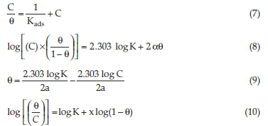 The experimental data and surface coverage were fitted into the Langmuir, Frumkin, Temkin and Flory-Huggins isotherms as represented by Equations (7), (8), (9) and (10), respectively: