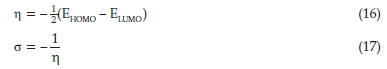 The global hardness (η) measures the resistance of an atom to charge transfer. In contrast, the global softness (σ) describes the capacity of an atom or group of atoms to receive electrons. The expressions for η and σ are given as follows: