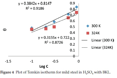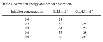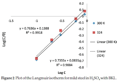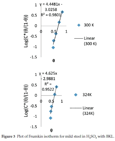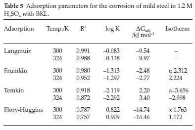 The parameters Ea and Qads for protection of mild steel in H2SO4 with BKL extract are shown in Table 4. The values of the activation energy obtained indicated that adsorption of BKL extract on the metal surface is by the phenomenon of physical adsorption. In all, the heat of adsorption is negative, implying that the attachment of the active species of BKL on the steel surface is exothermic, stable and spontaneous.