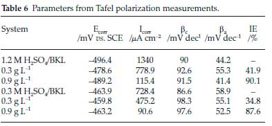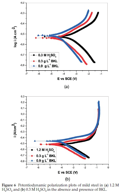 The phenomenon of inhibition is due to synergistic action. In general, a situation where the shift in Ecorr is above 85 mV, the inhibitor can be categorized in the rank of anodic or cathodic and if the shift is lower than 85 mV the inhibitor may be seen as a mixed-type inhibitor.39 The results of this study revealed that the phenomenon of the inhibition is a mixed-type corrosion control, with inhibition of both cathodic and anodic reactions.40 Also, at elevated voltages that are greater than circa -350 mV (SCE), it was observed that metal dissolution was greater than BKL adsorption.