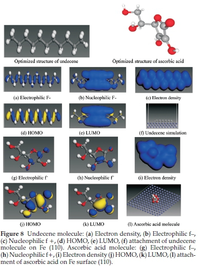 The major purpose for the computational study is not only to throw more light on the adsorption of the BKL extract but to further identify the contribution of a specific extract constituent through its adsorption phenomenon and energy. Density functional theory (DFT) calculations were carried out to design the electronic and adsorption structures of undecene (UD) and ascorbic acid (AA) as shown in Fig. 8 which was the main chemical constituents of the BKL extract. The constituents were analyzed by DFT electronic structure software DMol3 using a Milliken population test.51