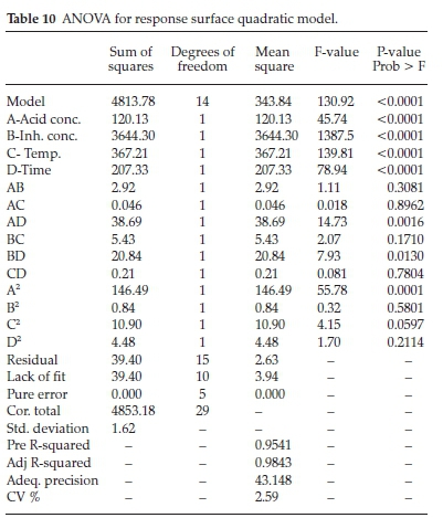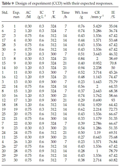 The design of an experiment is a systematic approach, before experiments that considers all factors involved simultaneously. It helps to analyze and pinpoint the sensitive areas in design that affect the desired response. Results of a 30-run experiment showing the interactive nature of the considered factors on the responses of the inhibition process are presented in Table 9.