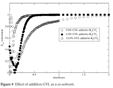 The second co-solvent used was glycerol as this is, in any case, a side product of transesterification. Although adding glycerol may be expected to slow down the reaction, in line with Le Chatelier's principle, because it is a by-product, it is also one of the few solvents that can completely dissolve sodium and potassium carbonates. It may, therefore, be expected that the presence of glycerol may lead to a more homogenous phase and hence speed up the reaction by reducing the crucial phase mixing time.