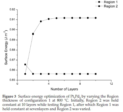 First, surface energy calculations were carried out on different sizes of Regions 1 and 2. Figure 3 shows the results of varying the sizes of Region 1 and Region 2, using the bulk of Pt3Pd2 configuration 1 as a representative example. For Region 1 the surface energy is stable at 3 -4 layers, however, it was decided to double the thickness to seven layers for all proceeding surface energy calculations to ensure convergence for the remainder of configurations. Region 2 shows stability at five layers and again it was doubled in thickness to 10 layers for all surface energy calculations, to ensure that the system converges with the remainder of configurations.
