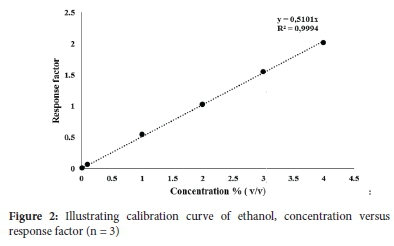 The quantitation and data acquisition were conducted using the GCMS solution version 4.45 software. A correlation coefficient (r2) of greater than 0.999 was obtained for both the ethanol and the isopropanol calibration curves.