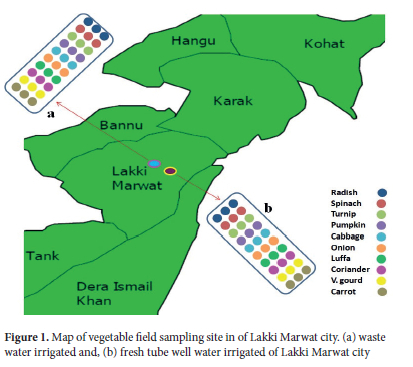 The laboratory analyses were carried out in the Chemistry Department at the Kohat University of Science & Technology in Kohat, Pakistan. Popular crops grown in Lakki Marwat region presented in Figure 1 consisted of turnip, radish, spinach, pumpkin, cabbage, onion, smooth luffa, coriander; vegetable gourd and carrot were investigated. Vegetable samples were taken from areas that were irrigated using untreated municipal effluent water as well as from fresh tube wells irrigated water vegetables of Lakki Marwat Pakistan (as shown in Figure 1). A total of thirty samples of ten different vegetable varieties were collected (triplicate) from both respective water sources. Thus a total of 30 samples were acquired. Selected fresh vegetable were collected from Lakki city of District Lakki Marwat, Khyber Pakhtunkhwa, Pakistan in December 2011 in the morning hours (from 9 am to 11 am). The study only used the edible portions of the vegetable for the laboratory analysis of the metals under investigation.