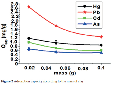 The adsorption capacity and percentage removal results are respectively shown in Figure 2 and 3. For an increasing mass of adsorbent (0.02 to 0.1g), the percentage of adsorption of chemical species by KAT clay increased. This elimination reached 63.86% for Pb, 45.25% for Hg, 31.92% for Cd and 25.46% for As. However, the variation of the adsorption capacity follows an opposite trend. This adsorption capacity decreased from 1.18 to 0.86 mg/g, 2.66 to 1.25 mg/g, 0.99 to 0.61 mg/g, and 0.68 to 0.50 mg/g for Hg, Pb, Cd and As, respectively. Several research works corroborate the increase in the percentage of elimination with the clay mass. It is due to the rise in the number of active sites available on the surface of the adsorbent 16,17. On the other hand, a greater quantity of clay tends to reduce the amount of pollutants adsorbed per unit mass. Olu-Owolabi et al.18 and Taha et al.19 also noticed that the adsorption capacity of bentonite decreased with increasing mass. They argue that at a constant volume of adsorbate, as the mass of adsorbent increases, there is an increase in the solid/liquid ratio, which leaves many sites unoccupied during the adsorption process and hence a reduction in capacity clay adsorption.