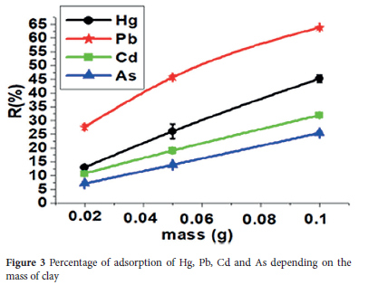 The study of the adsorption of ions on KAT clay as a function of the mass makes it possible to determine the quantity of adsorbent necessary for better adsorption efficiency. Thus, the elimination of ions was studied with different mass of raw clay. A series of tubes containing 10 mL of monometallic solution (Hg, Pb, Cd and As) of concentration 20 ppm, was introduced respectively to 0.02, 0.05 and 0.1 g of clay. The whole was stirred for 1 hour. The pH of the various solutions were adjusted to 5.7 by the controlled addition of HNO3 or NaOH.