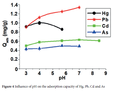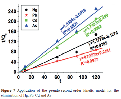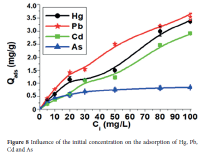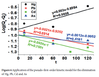 The chemical species (Hg, Pb, Cd and As) were adsorbed from monometallic and polymetallic solutions. To describe, qualify and quantify the elimination of chemical species, different mathematical models were applied to the adsorption results.