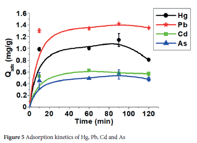 The adsorption reaction time was monitored from 10 min to 120 min for an initial content of 20 mg/L and a mass of clay of 0.1 g. The pH of lead, cadmium and arsenic solutions were fixed at 7. For mercury, the pH of the solution was set at 4. This study allowed the determination of the rate of elimination of pollutants and, consequently the assessment of adsorbent efficiency.