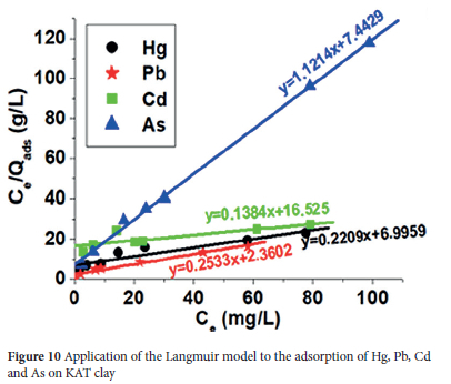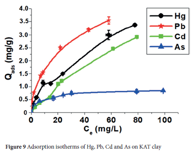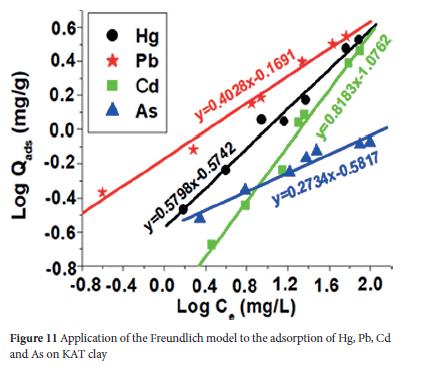, where KL represent Langmuir constant; Qmax is the maximum adsorption capacity and Kf and n are Freundlich constants. The Langmuir and Freundlich parameters (KL, Qmax, Kf and n), as well as the correlation coefficients (R2) are determined and presented in Table 3. The application of mathematical models to adsorption shows that the Freundlich model better describes the elimination ofmetal cations (Pb, Hg and Cd) (R2 > 0.98). On the other hand, the adsorption of arsenic is in agreement with the Langmuir model (R2 > 0.99). This observation confirms that the mode of adsorption of oxyanions is distinct from that of cations. Indeed, the adsorption of metal cations which follows the Freundlich model, supposes that the fixing of the chemical species takes place on a heterogeneous surface and that the number of sites likely to adsorb the species is unlimited39. This result corroborates that it is difficult to obtain a plateau on the adsorption isotherms of metal cations. On the other hand, the elimination of arsenic, which follows the Langmuir model, suggests that the number of sites likely to adsorb pollutants is limited and that the surface of the clay is homogeneous40. Moreover, the values of n (1 < n < 10 ) indicate that the adsorption of the chemical species on the KAT clay is favourable16.