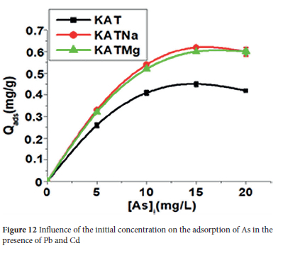 Figure 12 below shows the results of arsenic adsorption on KAT, KAT-Na and KAT-Mg clays. For an initial concentration ranging from 5 to 20 ppm, the adsorption capacity of KAT clay varied from 0.26 to 0.45 mg/g. Regarding clay saturated with sodium (KAT-Na), the adsorption capacity increased from 0.33 to 0.62 mg/g. As for clay saturated with magnesium (KAT-Mg), its adsorption capacity varied from 0.32 to 0.60 mg/g. Arsenic adsorption reached 59.04, 73.64 and 72.53% on KAT clays, KAT-Na, and KAT-Mg, respectively. Four key points were noted :