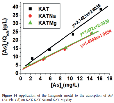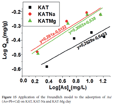 The correlation coefficients obtained by the Langmuir model are very satisfactory (R2 > 0.98) than those determined by the Freundlich linearization (R2 < 0.90). Consequently, the Langmuir model better described the adsorption of arsenic in the presence of lead and cadmium on KAT clays, KAT-Na and, KAT-Mg. Moreover, the values of Qmax obtained theoretically are very close to those determined experimentally. Relative to the adsorption on the KAT clay, the ratio