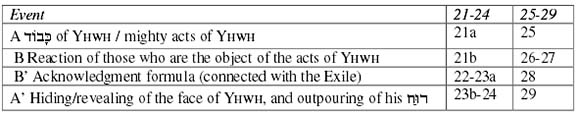 The judgment upon Israel is worded in Ezek 39:23-24 with the expres-sion that Yhwh hides his face (סתר פנים) from the house of Israel. The depar-ture of the כבוד of Yhwh, narrated in Ezek 8-11, was the concrete expression of the hiding of the face of Yhwh. The result was the destruction of Jerusalem and its temple. That Yhwh hides his face no longer is not only seen in the fact the he manifests his כבוד among the nations, but also - and, we may say, even more so - in the outpouring of his רוח upon the house of Israel.