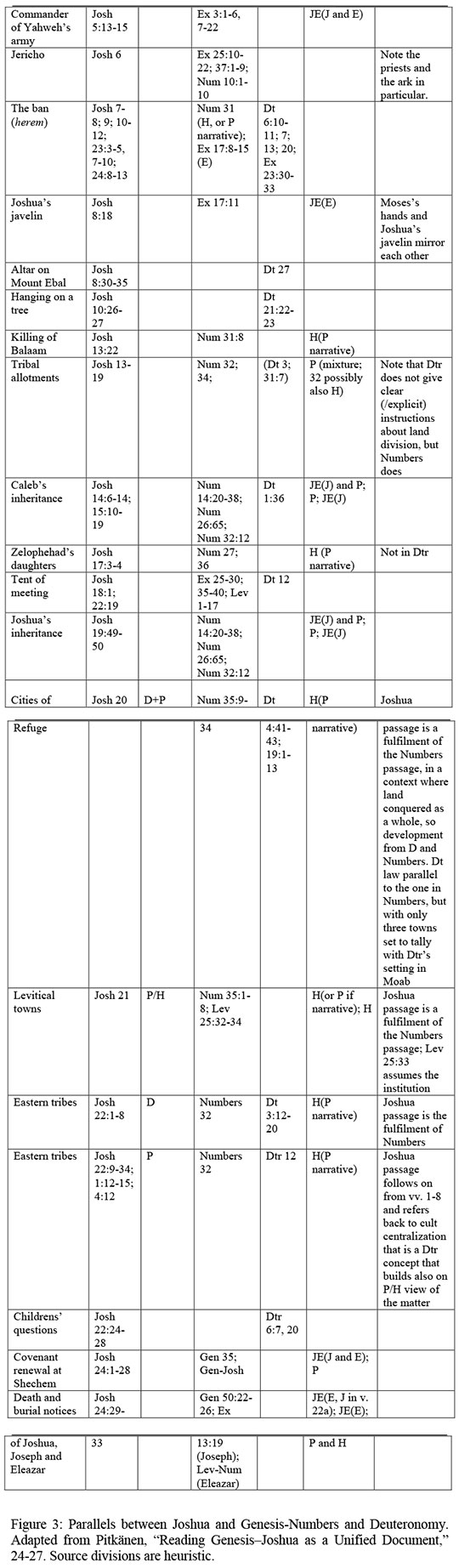 I will next present some concrete examples in support of the proposed approach. I will concentrate only on examples of passages that may have parallels with priestly materials, even if I will mention parallels to Deuteronomy only. Figure 3 below may be consulted for the presentation. Some further details about source division and utilisation in certain individual cases are included in my commentary on Joshua.22