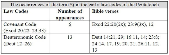 The law codes of the Pentateuch extensively refer to the םגֵרִי, but the earliest legal references concerning the treatment of the גֵרִים in the OT are found in the Covenant Code (CC) and in the Deuteronomic Code (DC).33