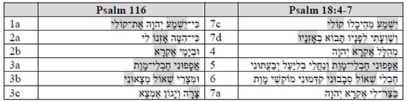 It is obvious that the source for the first three verses of Ps 116 is Ps 18:4-7. More or less half of the words and cola in Ps 18:4-7 were utilised in Ps 116, although in a different order. Noteworthy is the fact that the material from Ps 18:4-7 is incorporated as a unit in the first stanza of Ps 116.