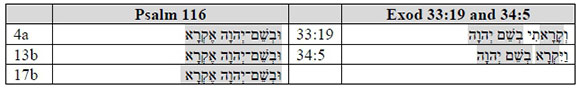 The phrase "in the name of Yahweh I call" is structurally and theologically a very important part of Ps 116. It is possible that the poet abstracted or borrowed this from Exodus, where it occurs in chapter 33:19 and 34:5. Beat Weber made a very important remark regarding the double meaning of קרא as "Anrufung" and "Ausrufung" in the sense of "call" and "proclaim" as well as the use of this word to introduce the theme of Ps 116.24