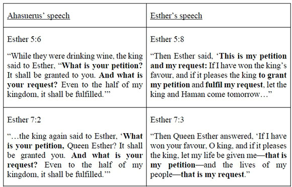 In response to Ahasuerus' question, Esther phrases her answer with this same carefully chosen language, "If I have won the king's favour, and if it pleases the king to grant my petition and fulfil my request" (Esth 5:8), inviting both Ahasuerus and Haman to come back the next day for another feast when she will answer the king's question. There is then an interruption in the continuation of Esther's hosting duties where Haman builds his gallows and Mordecai is honoured by the king in Esth 6. Once the narrative returns to Esther's feast (Esth 7:1), Ahasuerus again repeats his question (Esth 7:2) and again it is almost a word-for-word repetition of the question in both Esth 5:3 and 5:6. When Esther finally answers Ahasuerus with her petition asking him to save her life and the lives of the Jews, she states that "that is my petition... that is my request" (Esth 7:3). The similarities between Esther's answer and Ahasuerus' repeated question are clear at both feasts.
