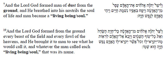 Perhaps it is from the above perspective that Gen 2:7 and 19 use the same Hebrew word for both humans and animals:
