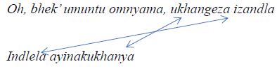 The words omnyama in line 1 and ayinakukhanya in line 2 allude to black (person) and darkness (the absence of light), respectively. Here, the song explicitly employs the term "black" people rather than "Africa-South Africans," as Masenya mostly prefers and Mtshiselwa notes with some reservations. The sound of nyama and khanya as well as (i)zandla and (i)ndlela constitutes a relative sound. Thus, there is a hearable rhyme which in terms of the placement of the lines form a chiasm. The chiasm in this instance likely functions as a stylistic tool to compare black people with the situation caricatured by darkness. The position and function of the hand (izandla) in relation to the journey (road) are characterised by darkness. Moreover, the word ayinakukhanya forms part of the figurative language employed by the songwriter that reveals the manner in which the imagery is used to represent indlela ("the journey or road").