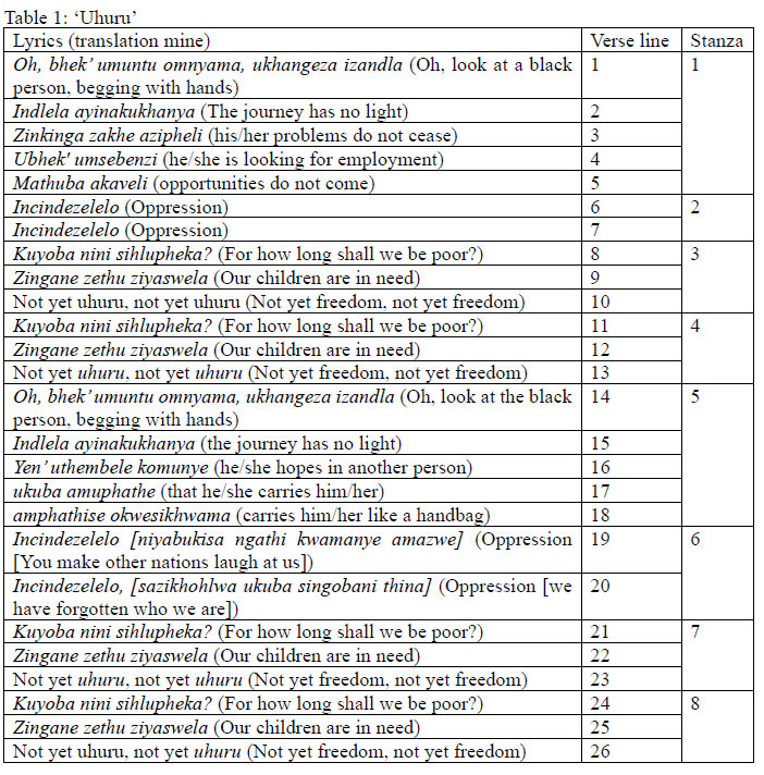 The statement, Sazikhohlwa ukuba singobani thina ("We have forgotten who we are") bears the same meaning without the pronoun, thina because the word, singobani means "who we are." The addition of the phrase and pronoun thina serves to emphasise the point that the songwriter identifies him or herself with the audience. As Mosala, West, Masenya and Mtshiselwa would argue,72identifying with the audience is cardinal, as one would be able to approach both indigenous texts, such as songs and proverbs as well as ancient texts with the lived experiences of black people which are central to the discourses. The songwriter adds the issue of identity to the song. Could it be that the issue of identity is partly pivotal to the debate on poverty? The song teases out the identity of blackness, of a people grounded in ubuntu, the poor people who are undignified in terms of race, class, gender and most importantly people who are far from being "free" and "liberated," as it is not yet "Uhuru."