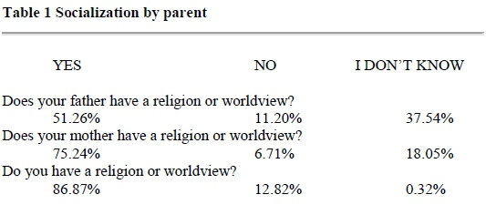 The most influential sources of religious information were: family, 74%; school, 54%; books, 50%; faith community 42%; friends, 20%; and the internet, 15% and media, 12%. Family was therefore seen as very important as a source of information about religion. A variable was added, the sharing of religious ideas by the respondent and their parents, to assess whether respondents' views depended on socialisation by their parents. It was assumed that respondents who did not know their parents' beliefs were not influenced by their beliefs. In Table 1 we see that in 37% of respondents did not know whether or not their father had a belief system, which reflected the fact that in many cases their fathers were absent, while only 11% knew their faith did not a belief system. Significantly more learners (75%) knew their mothers had a belief system, reflecting the general trend for women to be more religious than men and for children to have a closer relationship with their mother (ter Avest, Jozsa & Knauth 2010:302).