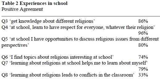 In Table 2, learners had strong positive agreement on the whole towards their experiences of religion in school.