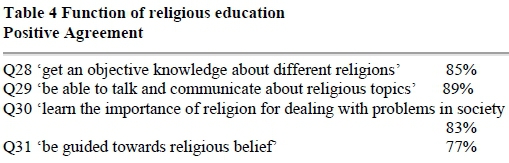 In terms of the function of religious education in schools there was very positive agreement for the suggestions that school could serve in this capacity (see Table 4).