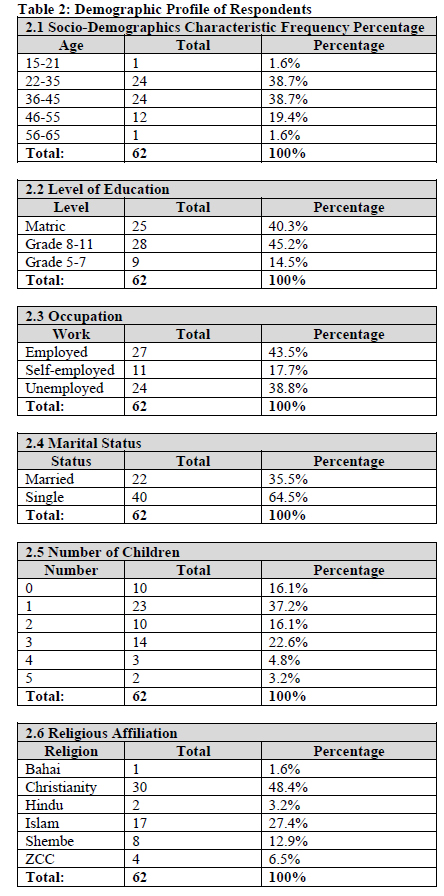 Almost two thirds (61.2%) of the respondents were in gainful employment or self-employed. More than a third (38.7%) of the respondents were unemployed. This pattern suggests that the rate of unemployment among offenders is higher than the country's norm of 33.9%. Notwithstanding, this finding refutes the notion that unemployment is the primary variable in offending. It confirms that irrespective of the material circumstances of offenders, offending is spread among both the employed and the unemployed with greater prominence among the unemployed. Just more than a third (35.5%) of the respondent were married while a significant number (64.5%) were single. Among those who were married only 16.7% had no children. A significant number had one, two, or three children amounting to 37.1%, 16.1%, and 22.6%, respectively. A small number had four or five children making up 4.8% and 3.2%, respectively. This finding suggests that despite having a sense of family responsibility it is not a deterrent to offend.