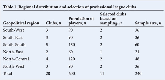 The target population of the study was 600 professional footballers from 20 clubs (30 players per club), who participated in the 2011/2012 NPL season.