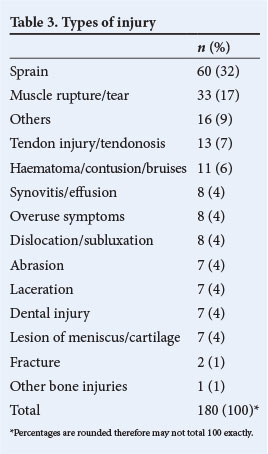 Most of the injuries occurred during matches (49%) and practices (38%) (Table 2).