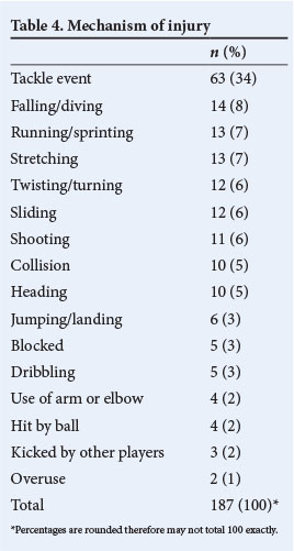 Tackle events (34%) and falling/diving (8%) were the predominant injury mechanisms (Table 4). Other injury mechanisms included running/sprinting and stretching, account ing for 7% each, and twisting/ turning and sliding, which accounted for 6% each. About 69% of injuries occurred while playing on grass surface, 28% on an artificial surface, and 3% on other surfaces. Approximately 37% of all the injuries were recurrent injuries, which affected the same body parts, while 63% of the injuries were first-time injuries.