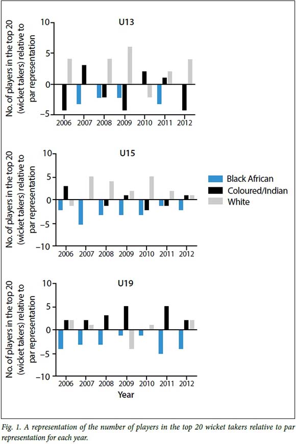 METHODS: Data of all players performing in the South African interprovincial under-13 (U13), under-15 (U15) and under-19 (U19) tournaments were analysed. Bowling performance (bowling average and the top 20 wicket takers relative to their par representation) and bowling opportunity (number of overs bowled) were compared between racial groups.