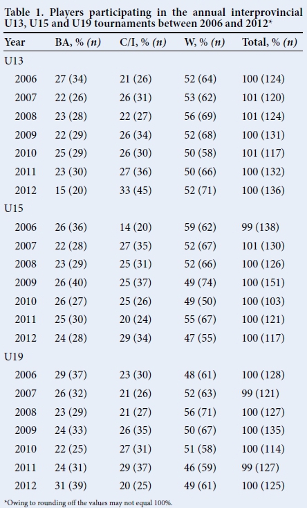 A total of 4 180 players participated in the U13, U15 and U19 inter-provincial tournaments between 2006 and 2012. Of these 4 180 players, 2 511 (60%) bowled. The number and per cent of BA, C/I and W players that bowled in these tournaments are presented in Table 1. Although the per cent representation varies in each year, there is relatively equal representation in the U13, U15 and U19 interprovincial tournaments between the W (~50%) and black bowlers (~50%) for each year. There was also similar representation between the C/I (~25%) and BA (~25%) bowlers.